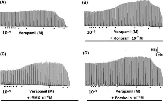 Figure 1. Increase of neurotransmission produced by pharmacological modulation of neural Ca2+/cAMP signaling interaction. (A) Records showing that contractile responses mediated by neurotransmitter released from sympathetic nerves by means electrical field stimulation in rat vas deferens (neurogenic contractions) were significantly reduced by L-type CCBs (verapamil) in high concentrations (>10-6 M), but paradoxically increased in concentrations below 10-6 M, characterizing CCBs-induced sympathetic hyperactivity. This increase of neurogenic contractions by verapamil (<10-6 M) was potentiated by pre-treatment of isolated tissue with cAMP-enhancer compounds, such as rolipram 10-7 M (B), IBMX 10-6 M (C) and forskolin 10-7 M (D). This potentiation by cAMP-enhancer compounds was prevented by inhibition of ACs with SQ 22536 (Data not showed). Each point below the record represents molar concentration of verapamil (interval of 0.5 log unity). Each line below the record represents incubation time with cAMP-enhancer compounds. Representative records extracted from Bergantin et al. (2013).
