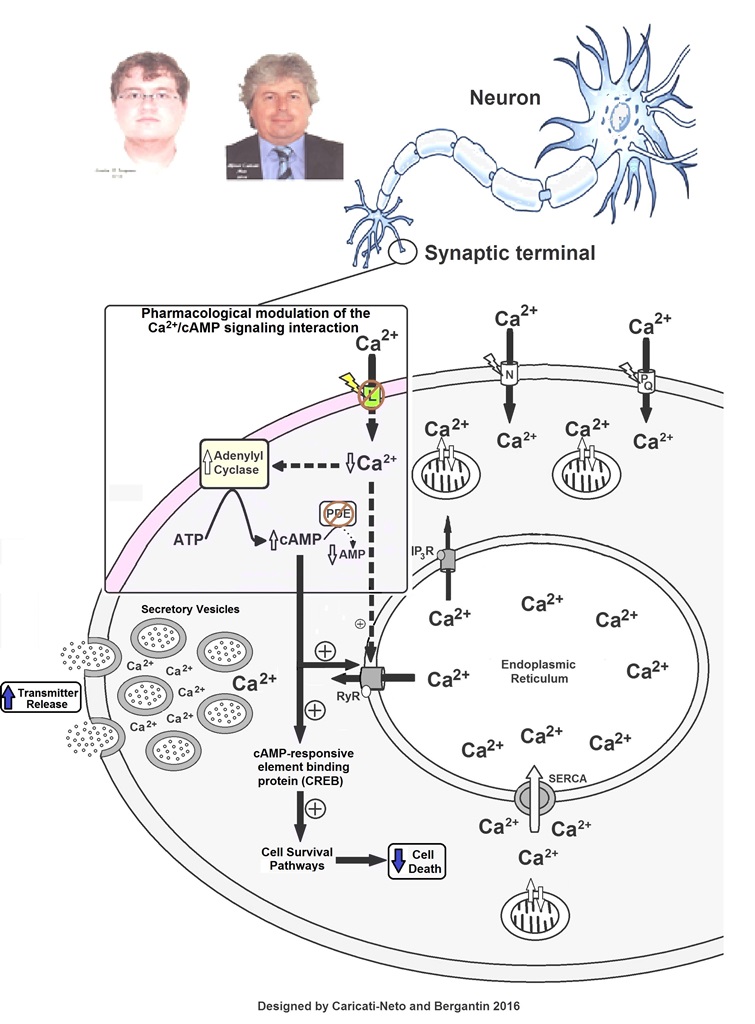 Figure 2. Increase of neurotransmitter release and attenuation of neuronal death (neuroprotection) produced by pharmacological modulation of the neural Ca2+/cAMP signaling interaction by combined use of L-type Ca2+ channel blockers (CCBs) and cAMP-enhancer drugs. PDE - phosphodiesterase inhibitors. Figure extracted from Bergantin and Caricati-Neto, 2016d).
