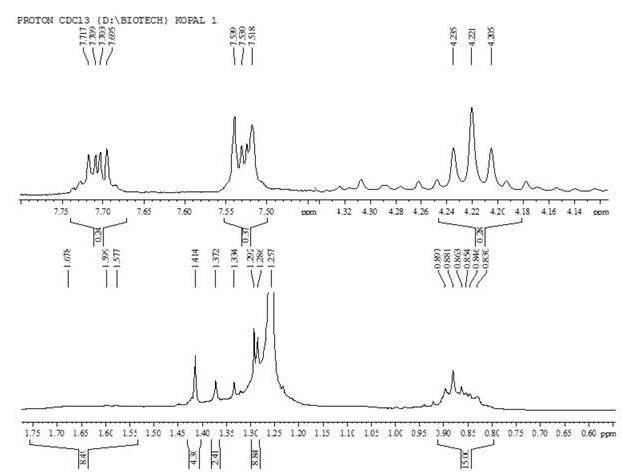 1H NMR spectrum of purified compound displayed two multiplets at d 7.70 and 7.52 ppm that correspond to H2 and H3 protons of the aryl ring. The multiplet at d 4.22 ppm corresponds to H4 protons of the hexyl substituent of the ester. A multiplet at d 1.41 ppm was due to H5 protons. The signals due to H6, H7, H8 and H10 were merged and appeared as a multiplet, centered at d 1.32 ppm. The signals pertinent to methyl protons H9 and H11 appeared as a multiplet at d 0.83 ppm (Figure 4).
