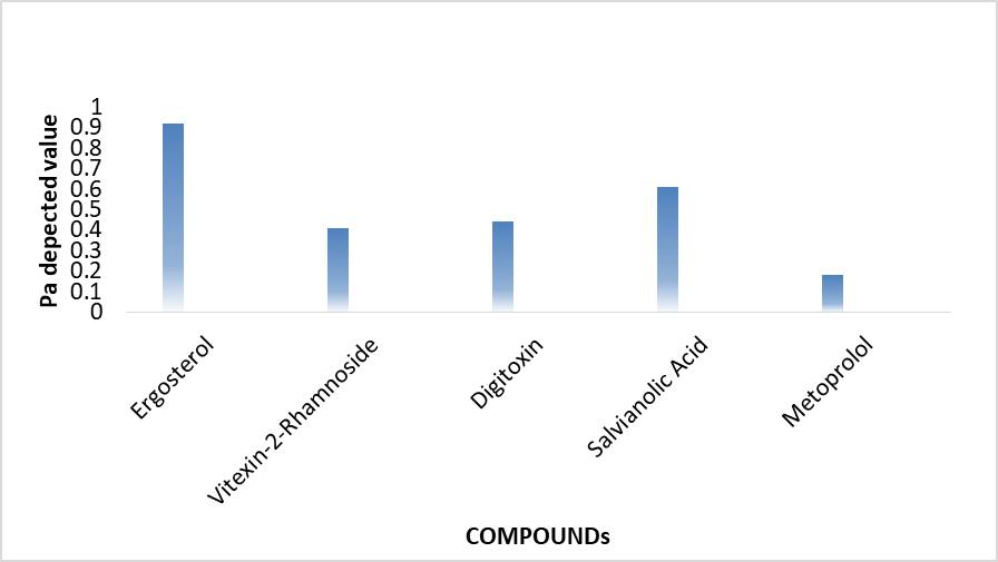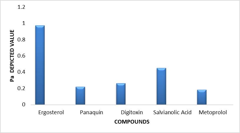 While selected phytoconstituents did not exhibit Anti-HCM, which perhaps could be co-related with the selected pharmacotherapeutic intervention, hence resulted phytoconstituents were Ginkgolides were one of them. Where Ergosterol shows more Pa value resulted most optimum for Anti-HCM activity which has shown all the activity by PASS software. Beforehand if we have to take a look the comparison of both marketed and phytoconstituents intervention, reported phytoconstituents have shown better-depected activity as compared to the marketed drug which has only been proven to show certain action mention in Table 1. With severe side effects. But this cannot be neglected that metoprolol has shown certain accepted activities as well.