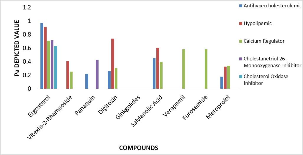 Marketed drugs as well as phytoconstituents were assessed by PASS helped prediction for required HCM related pharmacotherapy. The considered intervention were; (i) Antihypercholesterolemic (including anti-hypertensive activity); (ii) Antihypolipemic; (iii) Calcium Regulator; (iv) Cholestanetriol 26-Monooxygenase Inhibitor; (v) Cholesterol Oxidase Inhibitor. The results were obtained have been presented in table 1.