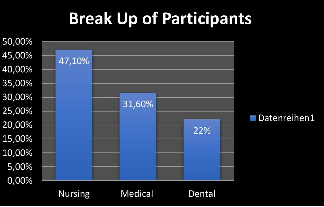 The participants of this study includes the second year medical students comprising of 203 students, nursing students were 100 and 61 dental students. A total of 364 students were send the Google form out of which 348(95.60%) students participated in the survey voluntarily. Out of 348 Students, 47.4% were nursing students, 31.6% medical students & 22% were dental students (Figure1).