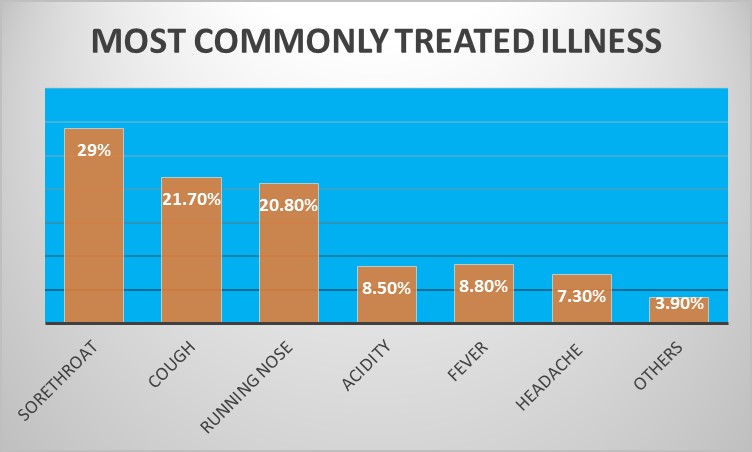 Self medication occurs for common ailments such as sore throat (29%), cough (21.7), acidity (8.5%), fever (8.80%), Head ache (7.30%) etc.(Figure 4)