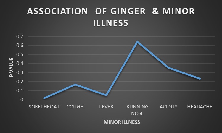 The use of ginger shows a statistically significant association in sore throat. There was no statistical significance found, in association with effectiveness of home remedies in condition like cough, headache (Figure 5).