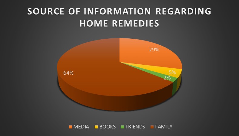 In our study the commonest sources of information about home remedies were elders at home (64%), followed by mass media (29%), books (5%) and friends (2%) (Figure 6).