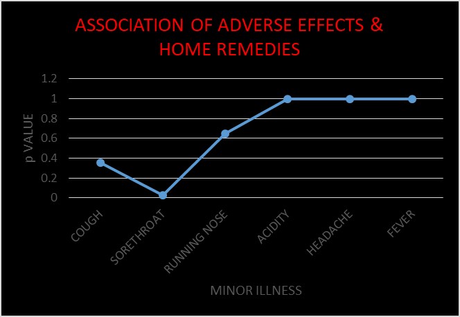 In this study we found that 2.1% of the participants experienced adverse effects from using home remedies.(Figure 9) Adverse effects is statistically significant with sorethroat than other common minor illness for which home remedies are used.
