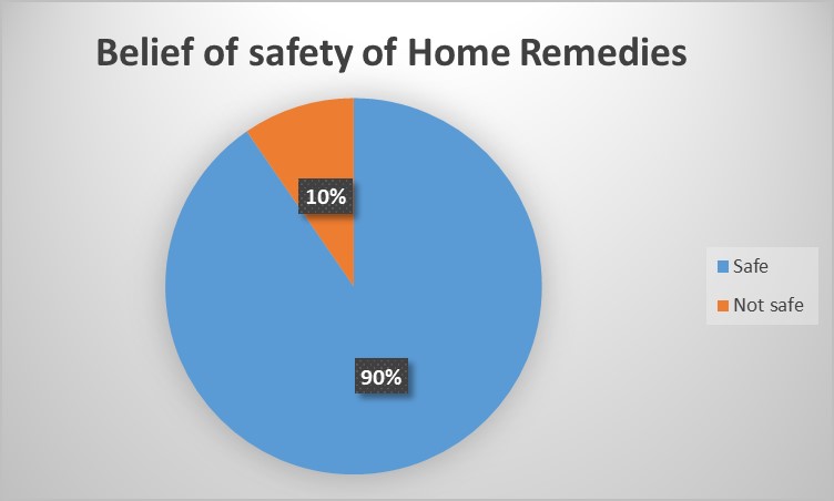 Home remedies are the preferred choice of treatment for minor illness by 64.3% participants because, they believe that home remedies are natural with no or less side effects and are cost effective . Home remedies are believed to be safe alternative to modern medicine in treating minor illness by 90.4% of the students (Figure10).
