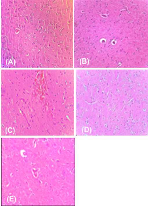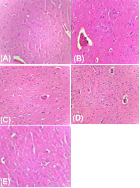 Figure 4. Photomicrograph of brain parenchyma tissue from MSG induced neurotoxicity: (A) Negative control (B) Positive control (C) Standard (D) Lower dose (250 mg/kg) of 70% EEBCG (E) Higher dose (500 mg/kg) of 70% EEBCG