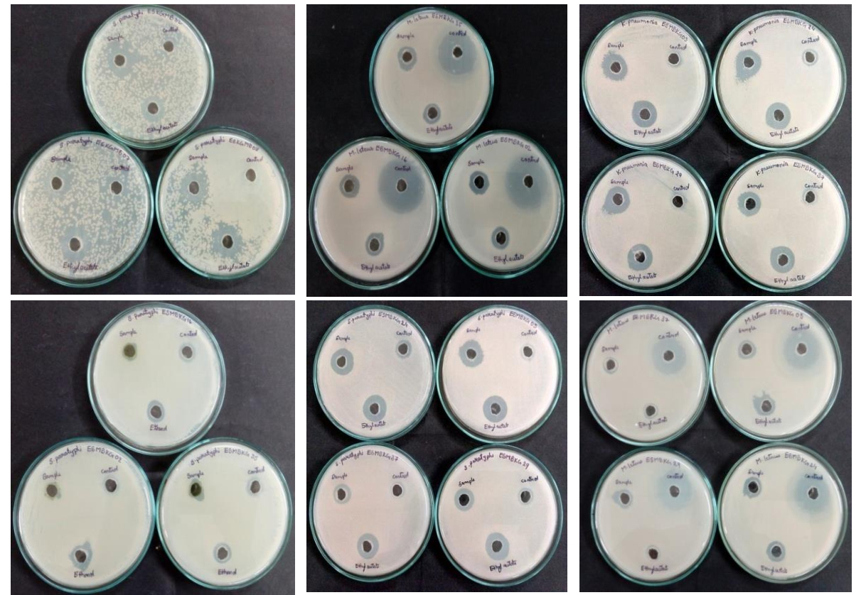 The axenic cyanobacterial cultures Oscillatoria sp, Microcystis sp, Dictyospaerium sp, Nostoc sp, Chroococcus sp, Anabeana sp were selected and screened for their antimicrobial activity against Staphylococcus aureus, Micrococcus luteus, Escherichia coli, Salmonella typhi, Salmonella paratyphi, Klebsiella pneumonia. For extraction a volume of 3L of 25th day culture was reduced to 200ml by rotary evaporator (SENCO technology Co., Ltd. China) at 40°C. 300ml of ethyl acetate was added and the mixture was shaken for 24hours. The ethyl acetate layer was separated from the aqueous layer. The aqueous layer was shaken again with 300ml of fresh ethyl acetate. The ethyl acetate layers were combined and dried with Na2SO4 in rotary evaporator at 40°C to remove the organic solvent. The remaining residues of ethyl acetate were removed by air dry at 32-38°C. The aqueous layer was discarded. The extracts were weighed and stored at -20°C until use (Bui, 2014).