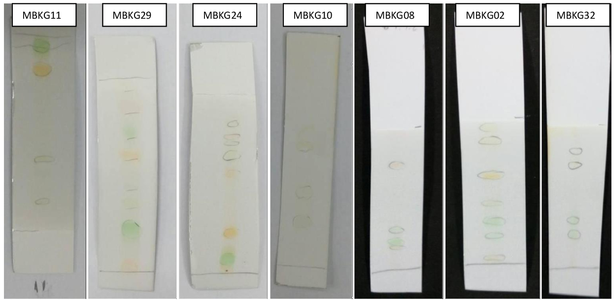 The analysis of TLC moderately depends on the adsorbent material, temperature and pressure in the solvents as well as the spotting distance. The value of the retention factor is not constant in practice. The dried cyanobacterial ethyl acetate extracts (100mg) were dissolved in 3ml of methanol (25%) for purification using TLC plates (10х10cm; 0.25mm layer thickness). The aliquots were directly spotted two centimeters from the edges of a silica gel coated TLC plate. Separations of crude extracts were done using ethyl acetate: methanol: water (7:2:1) as mobile phase (Bui, 2014). Spots developed on such TLC plates were observed under UV illumination. The illuminated orange spots were eluted separately and dissolved in 3ml methanol (25%), each elute again subjected to TLC purification using Ethyl acetate: methanol: water (7:2:1). Now all spots obtained at second stage were bio assayed for antibacterial activity by agar well diffusion method (Maheep et al., 2014).