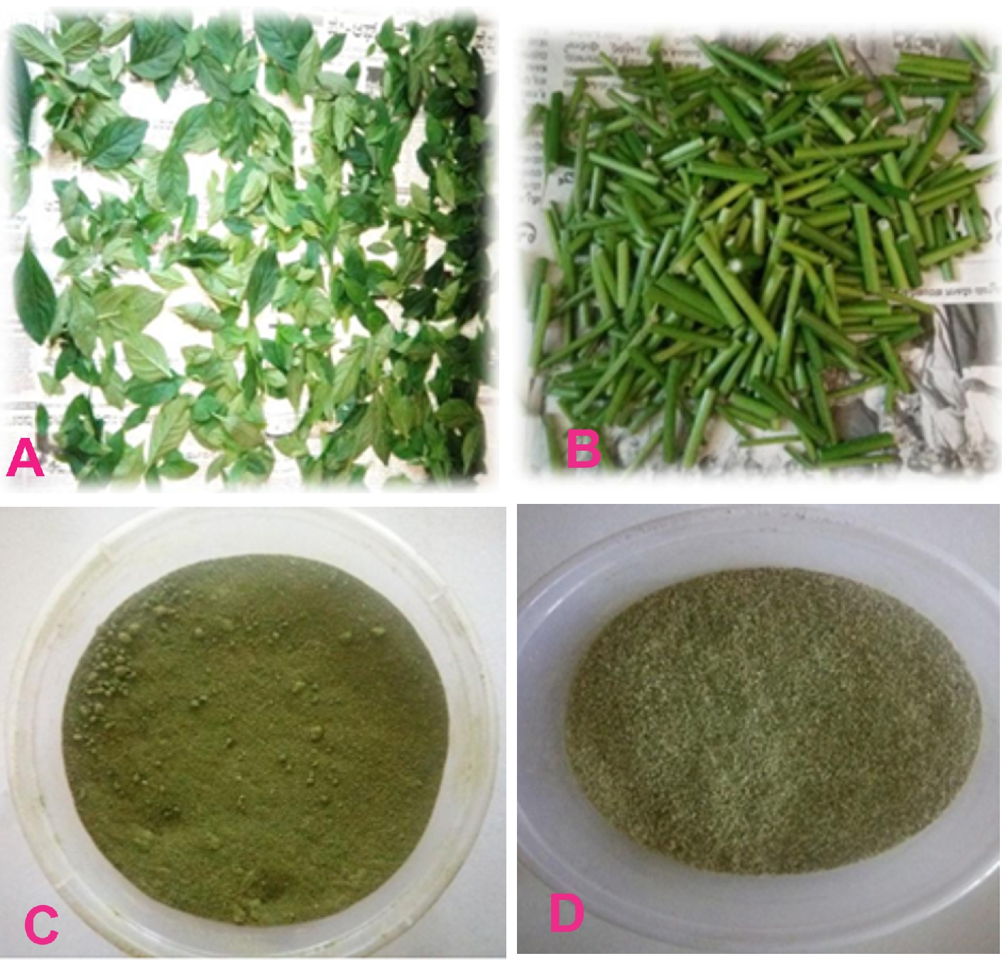 Figure 2. A. Alternanthera paronychioides leaves; B: Alternanthera paronychioides stem C: A. paronychioides leaves powder; D: A. paronychioides stem powder