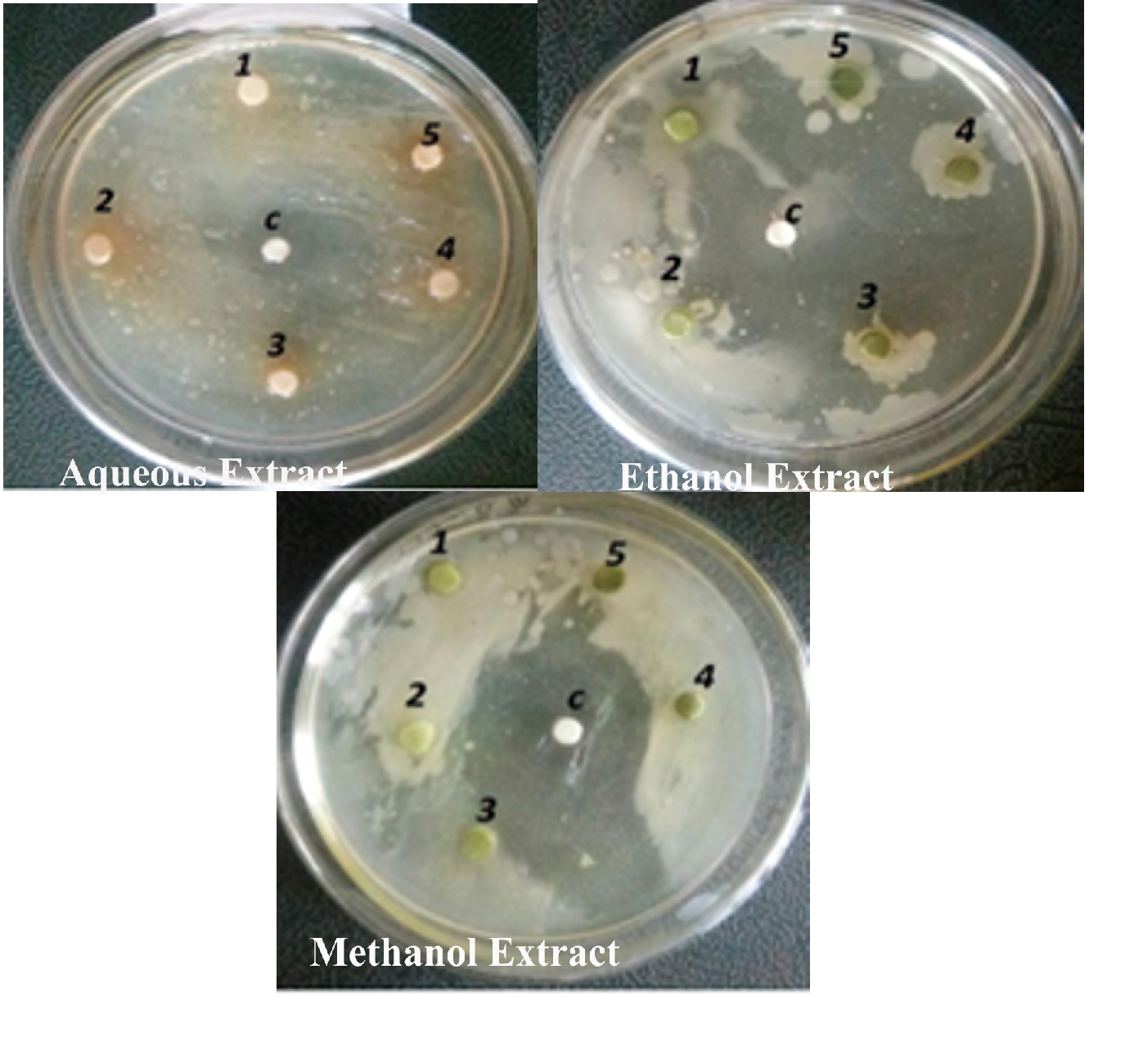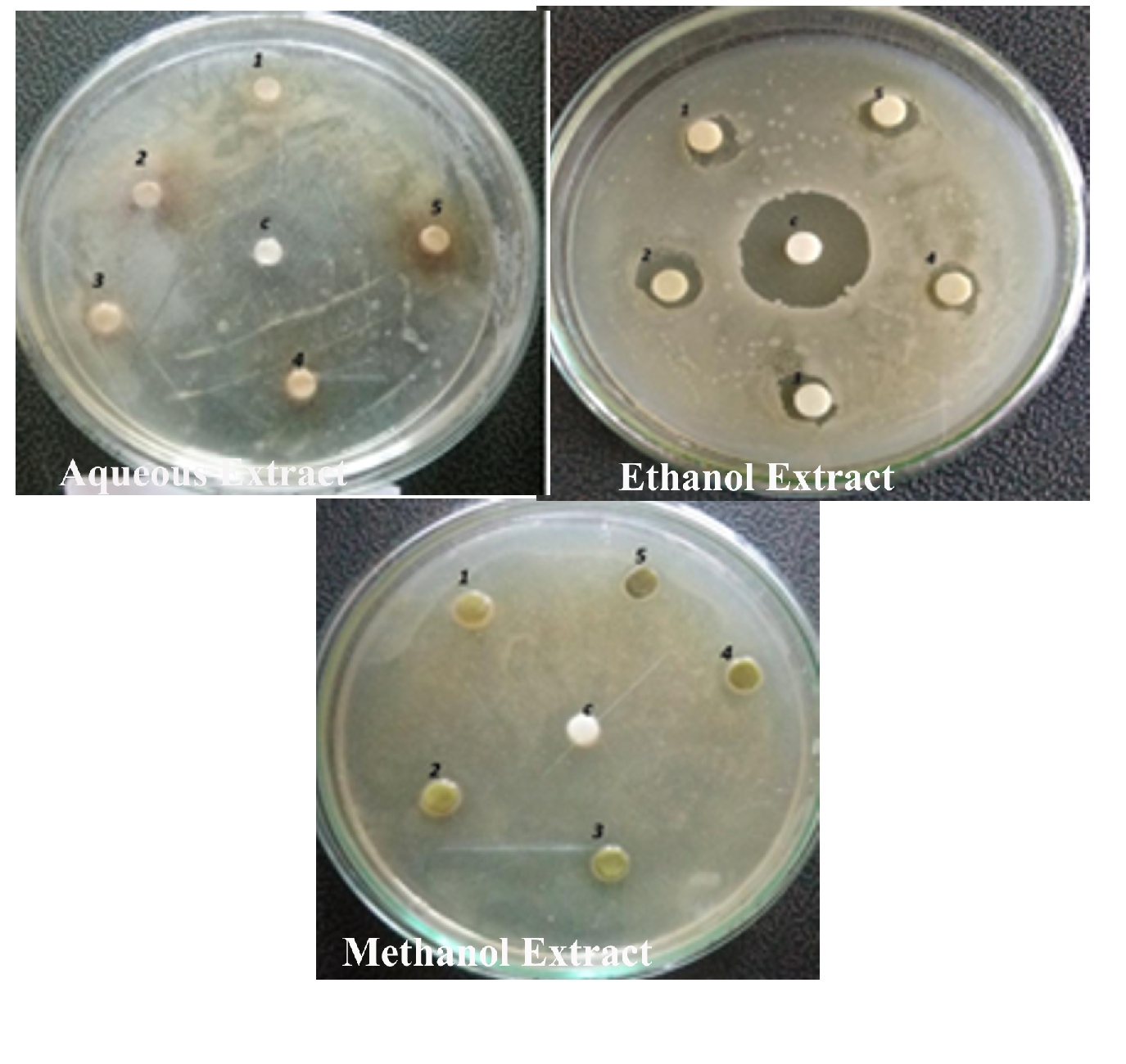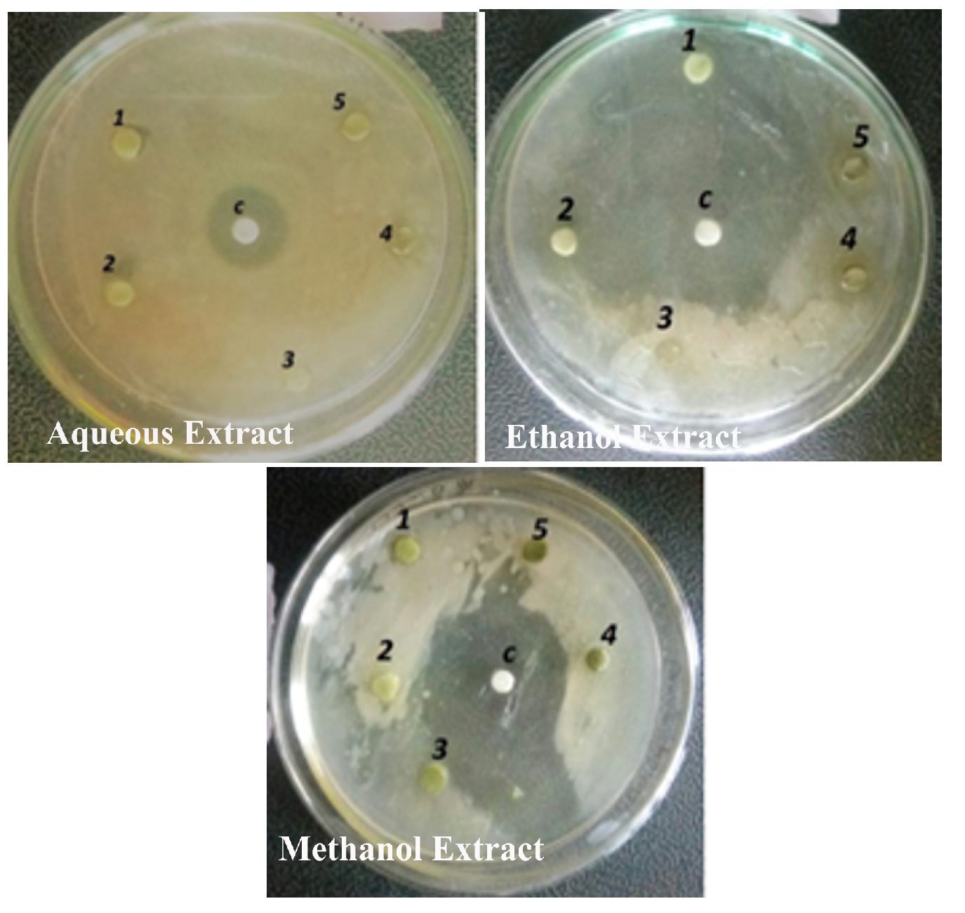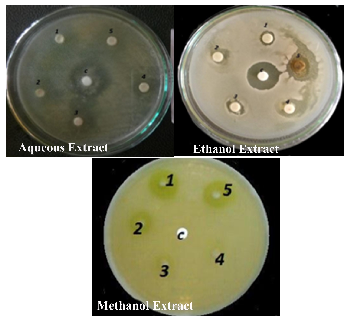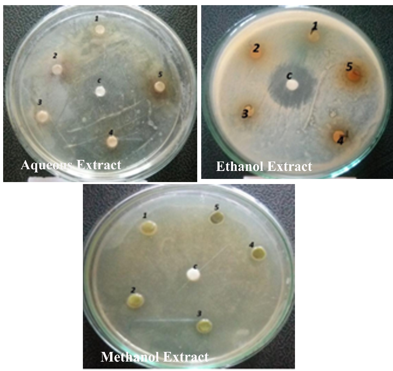 Antimicrobial assay of extracts of different plants was performed by agar well diffusion method in Mueller Hinton Agar (MHA) plates. The test organismswere obtained from Department of Botany, Manasa Gangotri Mysore, inoculated in Nutrient broth and incubated overnight at 37°C to adjust the turbidity to 0.5 McFarland standards solution. MHA plate was lawn cultured with standardized microbial culture broth. Plant extracts of 50 mg/ml concentration were prepared; wells of 6 mm were bored in the inoculated media with the help of sterile cork-borer. Each well was filled with 50 μl extracts from different plants: with positive and negative control respectively. It was allowed to diffuse for about 30 minutes at room temperature and incubated for 18-24 hours at 37°C. After incubation, plates were observed for the formation of a clear zone around the well which corresponds to the antimicrobial activity of tested compounds. The zone of inhibition (ZOI) was observed and measured in mm (Niranjan, 2020).
