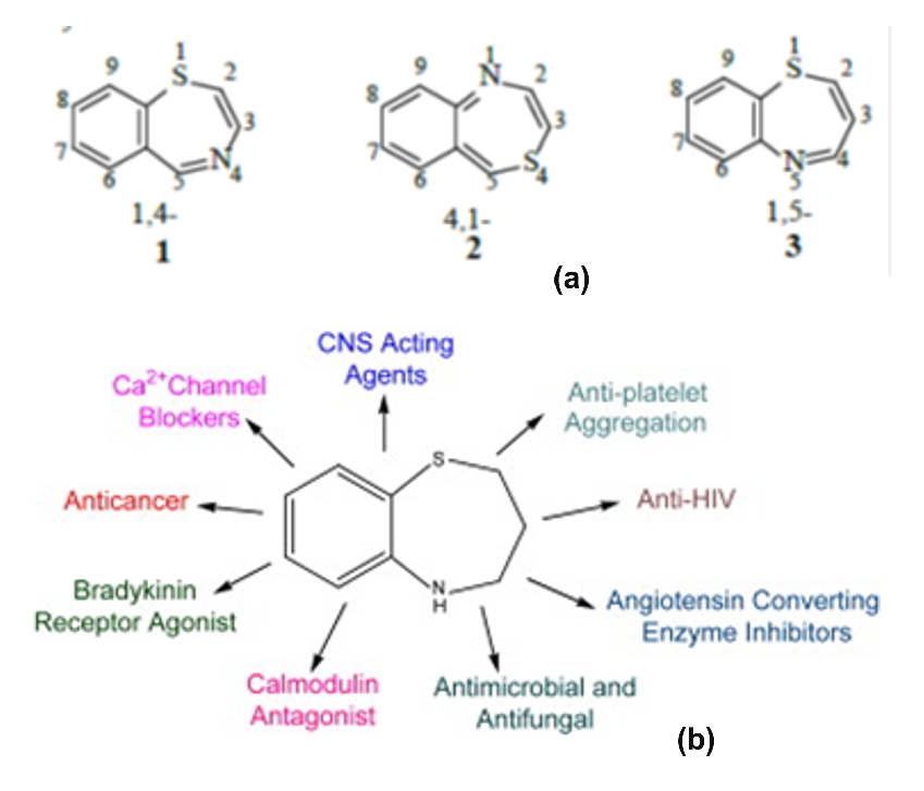 Figure 1. (a) Benzothiazepine derivatives and, (b) biological potential of benzothiazepine derivatives
