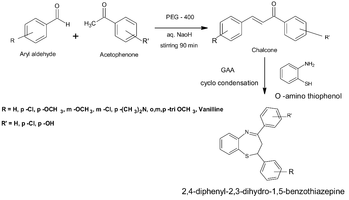 The synthesis of 1,5-benzothiazepine from substituted chalcones were done by preparing the individual chalcones by reacting substituted aryl aldehyde with substituted acetophenone in aqueous ethanol in presence of alkali catalyst, to this reaction PEG-400 which acts as biodegradable, increasing the solubility property of reacting mixture and speed up the reaction rate, which can easily separated as it is water soluble. From the previous experimentation the time taken for chalcones formation is two folds high as compared with presence of PEG-400 which finish the product formation with in 90min, the yield of the product is also appreciable. The obtain chalcones are further treated with O-amino thiophenol of 1:2 ration in presence of weak acid called glacial acetic acid as catalyst in alcohol media undergoes thia-Michael addition of the thiol group to the enone functionality of the chalcones to form the intermediate followed by cyclo condensation to produce Benzo1,5-thiazepine. Which are purified and evaluated for structural characterization by FT-IR using KBr pellet method for determining regions like C=C at 1540 bending, CH at 3080 stretching, functional group like –OH at 3360, -OCH3 at 2900, C=N at 1715 and C-N at 1200 cm−1. 1H-NMR done to determine the δ value in ppm - 4.6 (s, 1H, CH-S), 3.5 (s, 3H, OCH3), 7.3-7.6 (m, 6H, Benzothiazepine), 7.8-7.9 (m, 8H, aromatic ring), 9.8 (s, 1H, OH), 2.9-3.2 (m, 6H, N(CH3)2). The exact mass of the compounds are obtain by EI-MS whose compounds shows appropriate mass value in m/z. From the above spectral data the plausible structure of the 1,5-benzothiazepine and its derivatives are formed and confirmed.
