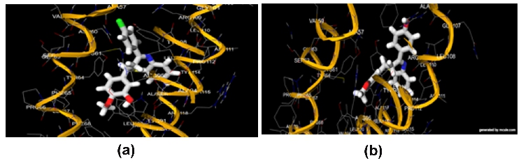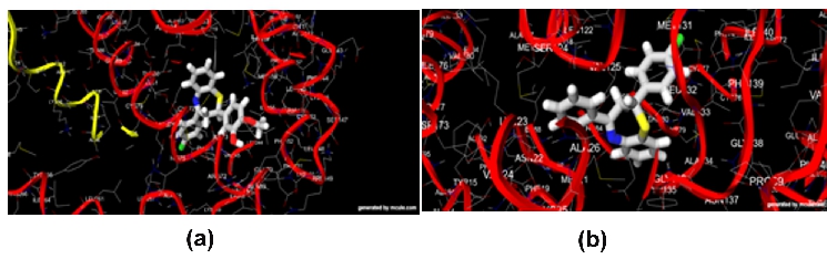 Figure 3. Docking snapshot of the best compound on LTC4S enzyme: (a) BTP-3 (Docking score -11.2 kcal/mol); (b) BTP-5 (Docking score -10.8 kcal/mol)