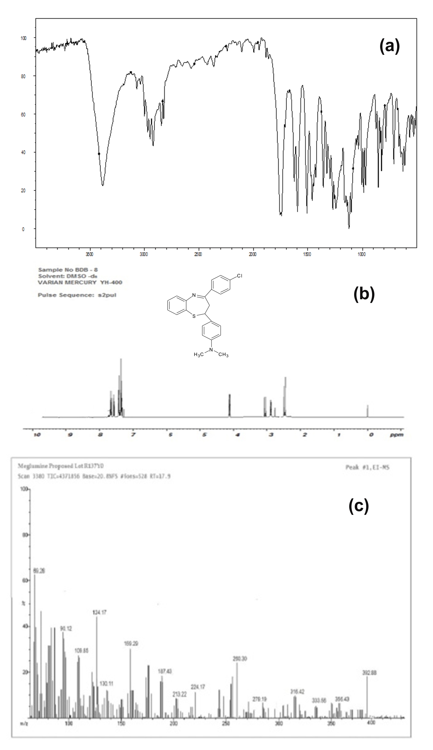Figure 5. Sampling of BTP-8: 4-[4-(4-chlorophenyl)-2,3-dihydro-1,5-benzothiazepin-2-yl]-N,N-dimethylaniline (a) FTIR spectra; (b) NMR Spectra; (c) MS Spectra