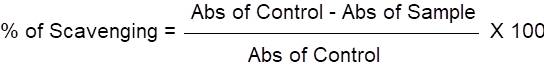 The hydrogen peroxide scavenging ability of test compound was determined according to the method of Ruch et al. (2014) A solution of 30% hydrogen peroxide 40mM was prepared in phosphate buffer (pH-7.4) 100, 200 & 400 μg/ml conc. of the all test compounds. Standard L-ascorbic acid is prepared by dissolving in suitable solvent. In a test tube add 1ml of different concentrations of test and standards are taken. To this 3.4 ml of phosphate buffer were added, 0.6ml of prepared hydrogen peroxide solution 40mM is added. Keep the mixture for 10 min at room temperature or incubate at 37 0C for 5 min. The absorbance value of the reaction mixture was recorded at 230nm. The percentage of scavenging of hydrogen peroxide was calculated by using equation (2).