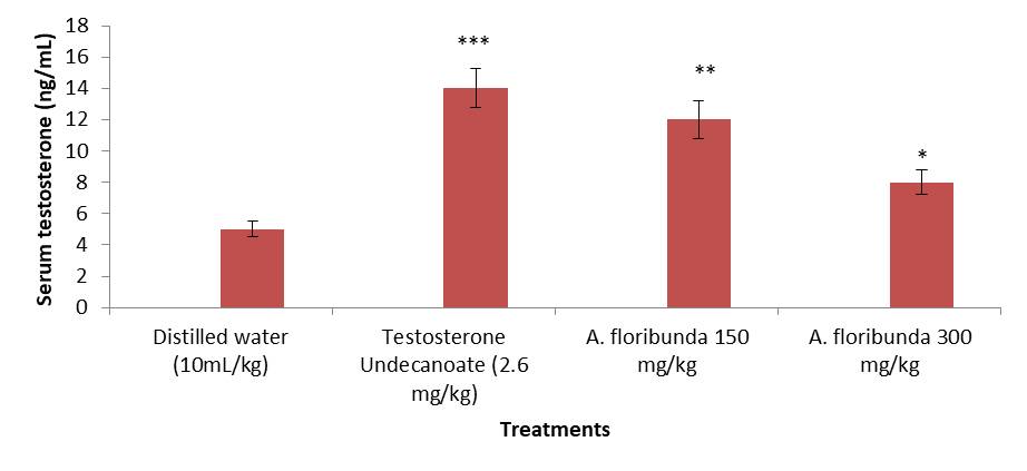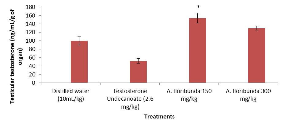 The androgenic and anabolic effects of the aqueous extract of A. floribunda as well as its aphrodisiac properties, which is important at the dose of 150 mg/kg, could suggest a saturation of the receptors of the bioactive compounds present in the plant at the high dose (300 mg/Kg). This may be due to the competition between the bioactive phytochemical compounds hydroxyl groups’ hydrogen bond formation and the cells or organs.