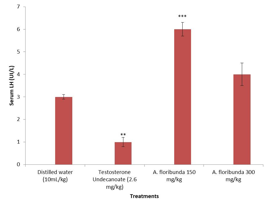It is well known that the secretion of gonadotropins (LH and FSH) is controlled by hypothalamic (GnRH) and testicular hormones (Gharib et al., 1990). FSH is necessary for the initiation and maintenance of spermatogenesis while luteinizing hormone stimulates the synthesis and secretion of testosterone. The increase in the testosterone level could be due to the stimulation of the GnRH-LH signaling pathway as the extract also induced the increase of the LH level. Thus, high levels of gonadotropins and serum testosterone can be explained by a reduction or the blockage in the negative feedback of steroid hormones on pituitary gonadotropins by the extract (Malini et al., 1999). The increase in LH level caused by the aqueous extract of A. floribunda stem bark would have stimulated the production of testosterone as observed in this study. The pro-gonadotropic effect of A. floribunda aqueous extract is an indication of the ability of this extract to wisthand in the normal functioning of Sertoli cells, which in turn could stimulate the maturation of spermatozoa. The increased concentration of hormones is an indicator of a direct action on testicular hormonogenesis. Sufficient gonadotropin levels and increased testicular activity are signs of androgenicity. Thus, both androgenic and anabolic properties of the aqueous extract of A. floribunda have been proven in rats.