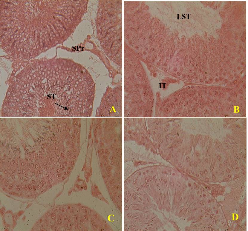 Figure 4. Microphotographs of the testis of rats treated with distilled water (A), Testosterone undecanoate (B), aqueous extract of A. floribunda at doses of 150 mg/kg (C) and 300 mg/kg (D) during 8 days (X400 H&E). (ST) seminiferous tubules, (SPr) sperms, (LST) lumen of the seminiferous tubules, (IT) interstitial tissue.