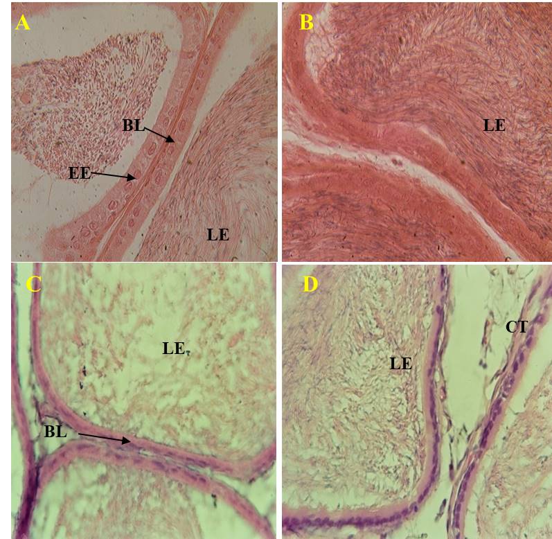 Figure 5. Microphotograhs of the epididymis of rats treated with distilled water (A), Testosterone undecanoate (B), aqueous extract of A. floribunda at doses of 150 mg/kg (C) and 300 mg/kg (D) during 8 days (X400 H&E). (BL) basal lamina, (EE) epithelium of the epididymis, (LE) lumen of the epididymis, (CT) connective tissue.
