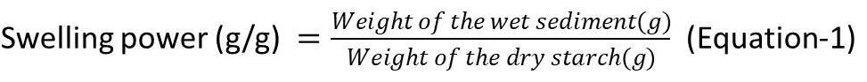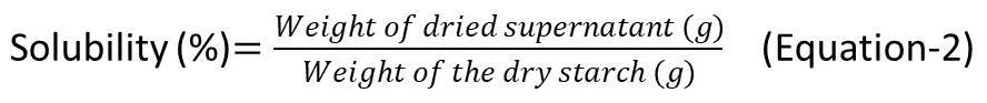 To determine the swelling factor, a starch sample was weighed accurately in a centrifuge tube before 40 mL of distilled water were added. The slurry was heated at 80°C in a water bath for 30 min. subsequently after, the samples were cooled to room temperature and the solution was centrifuged at 3000 rms for 15 minutes. The supernatant obtained was carefully removed, and the swollen starch sediment was weighed. The aliquot of supernatant was evaporated overnight. Analyses were performed in triplicate. Swelling power and solubility were calculated as follows: