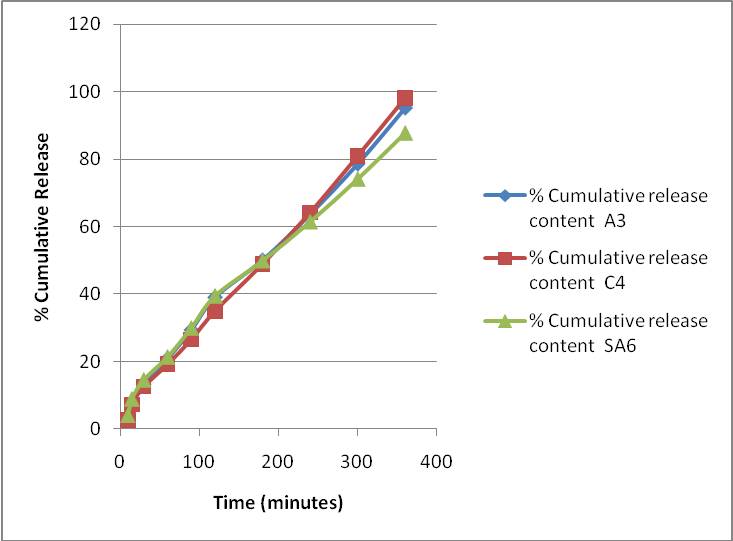% Cumulative release of drug from batches A3, C4 and SA6 is given in figure 3.