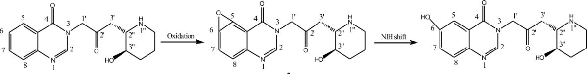 In 2006, Zhu et al. synthesized and evaluated a range of novel febrifugine analogues based on the work by Hirai et al. Many of the analogues synthesized by Zhu et al. possessed lower toxicity than the parent alkaloid. Based on these findings it was proposed that Febrifugine, 1, is found to be metabolized to the corresponding arene oxide 3 by cytochrome P-450 enzymes (Fig. 2). When arene oxide 3 escapes deactivation process by certain enzymes such as epoxide hydrase or glutathione S-transferase, toxicity can result because this reactive electrophile will form covalent adducts with DNA, RNA, proteins, or other biomolecules of the host. Such binding can cause mutations and result in cell damage. In a recent metabolic study of febrifugine, Oshima and co-workers isolated metabolite (Hirai et. al., 2003). This study indicates that arene oxide is most probably a short-lived reactive metabolic intermediate because metabolite would have been derived from intermediate through the rearrangement known as NIH shift (Guroff et. al., 1967).