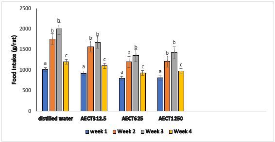 During the 28 days of oral administration of AECT, rats were fed a standard diet. Figure 1 the effect of AECT on food intake. It emerges from this figure that in general, the food intake increased during the first 3 weeks of treatment with AECT with greater increase in the animal control group receiving the distilled water. During the fourth week of treatment with AECT, a decrease in food intake was observed whatever the group. However, food intake remained higher than that of the first week. Generally, in the control group, the increase in food intake is 18.82% compared to 19.37%, 15.87% and 20.32% for the treated groups with the different doses of AECT respectively 312.5 mg / kg, 625 mg / kg and 1250 mg / kg. Despite these increases, no significant difference was observed between the groups.
