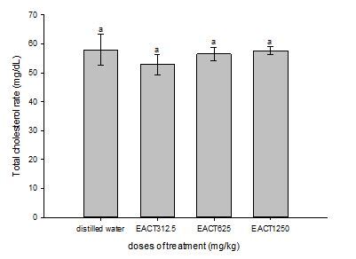 Figure 4 explores the total cholesterol level of normal and AECT treated animals after the 28 days experimental period. The results revealed that the extract does not adversely alter the total cholesterol level of the animals after subchronic treatment. No significant difference in serum total cholesterol levels in rats treated with AECT for all the dose compared to control