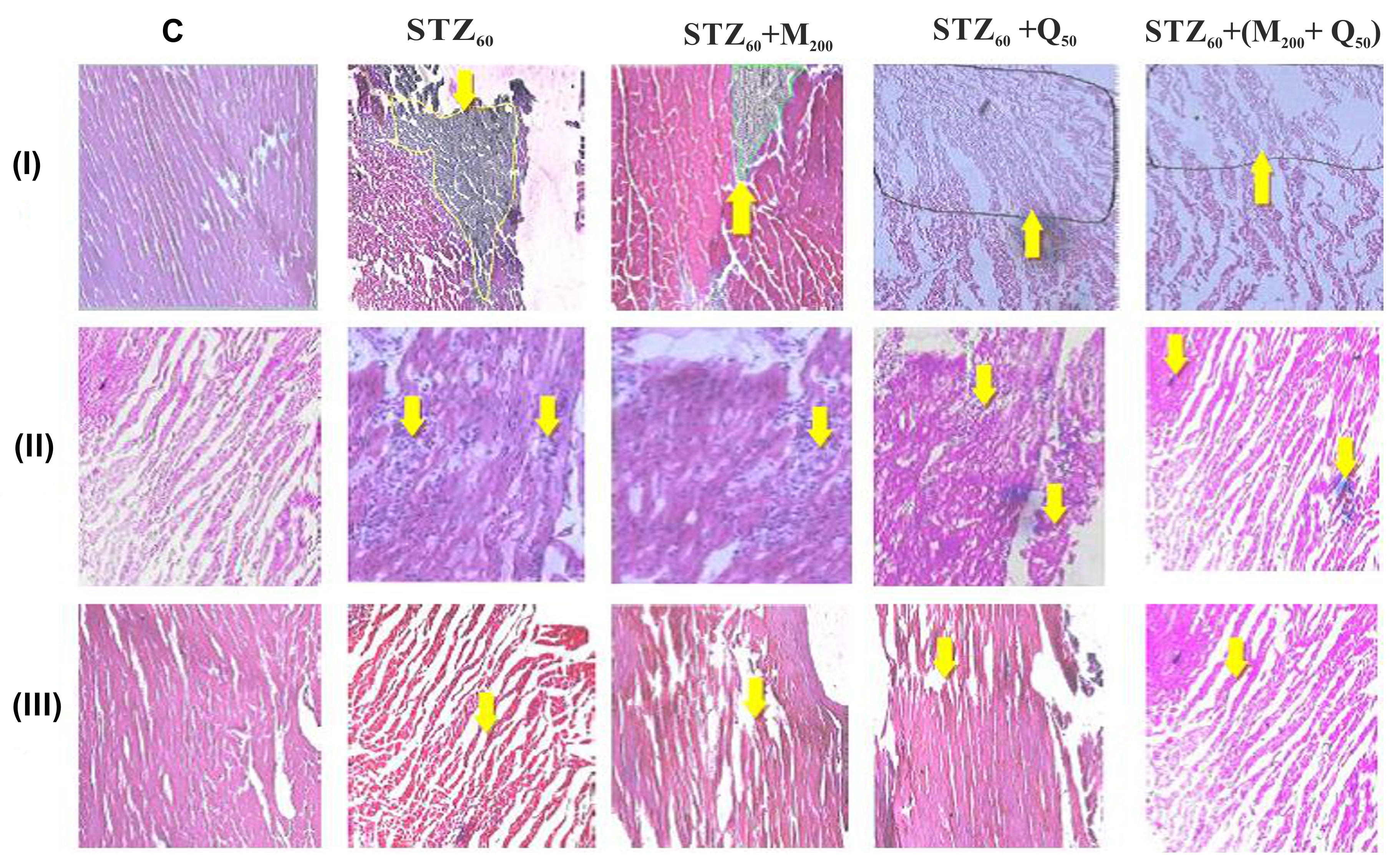 Figure 1 (I, II and III) Represent images of histopathological examinations of heart- infarct area, Necrosis and separation of myocardial fibers respectively; Study group (C) Normal control rats injected with vehicle (citrate buffer); group (STZ 60) disease control administered (STZ 60mg/kg i.p single dose);; group (STZ 60+ M 200) Metformin test group received (STZ 60mg/kg i.p single dose + Metformin 200 mg/kg/ p.o); group (STZ 60+ Q 50) Quericitine test group received (STZ 60mg/kg i.p single dose + Quercetin50 mg/kg/ p.o) group [STZ 60+ (Q 50+M 200)] both test drug combination dose groups [(STZ 60mg/kg i.p single dose + (Quercetin50 +Metformin200mg/kg/ p.o.)].Heart sections were fixed and stained with hematoxylin and eosin (H&E) stain. Images were taken at 100× magnification and scale bar = 10µM. In Figure 1 (I, II and III) group (C) showed clear normal integrity of myocardial cell membrane; in group (STZ 60) examination of the showed marked myonecrosis, edema, muscle separation and infiltration of inflammatory cells were observed (arrow).The reduction of histopathological scores in (STZ 60+M200) and (STZ 60+Q50)also showed less edema and necrotic (arrow) changes and group [STZ 60+ (Q 50+M 200)] showed, remarkably histological protection of the myocardium.